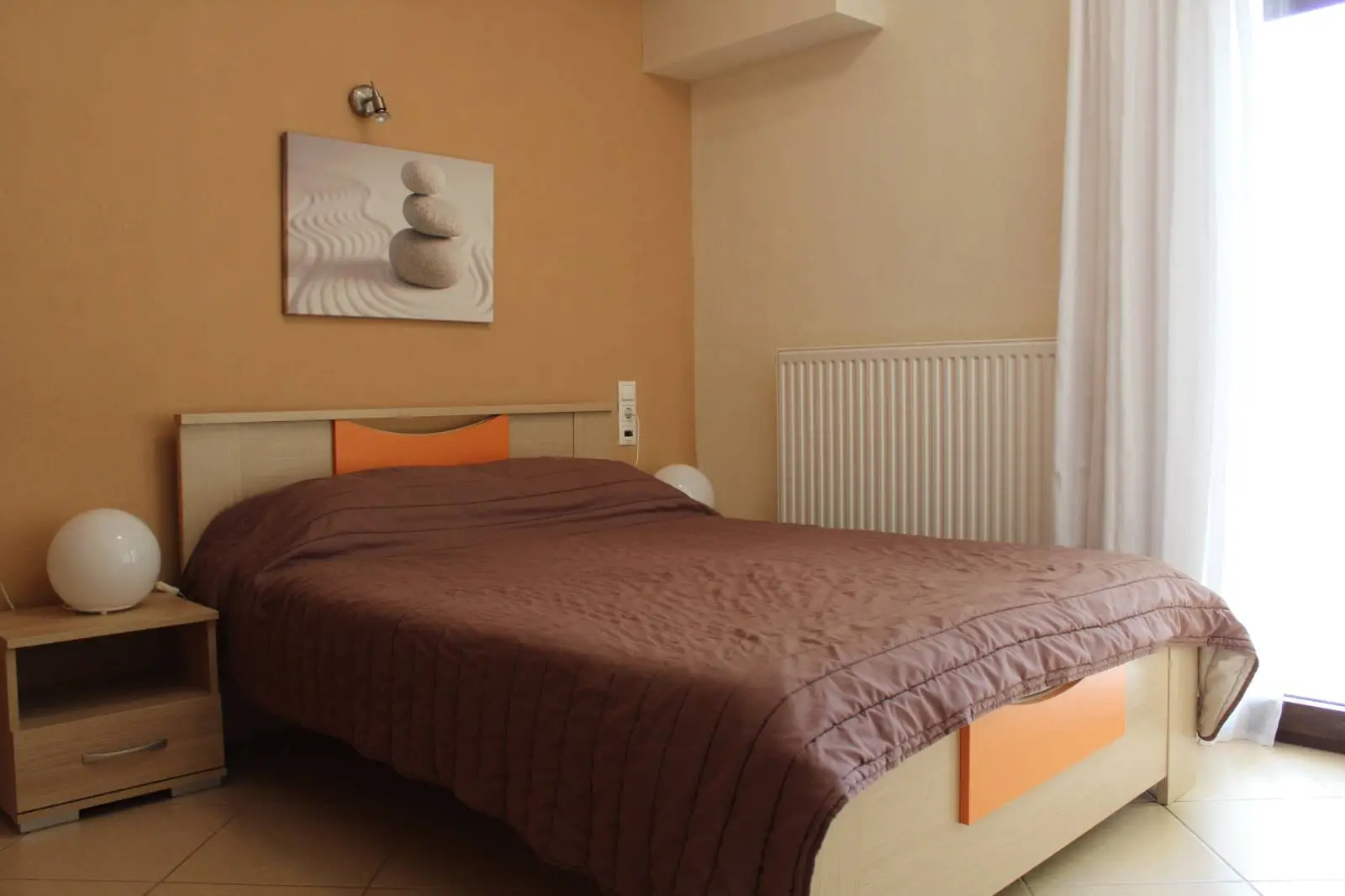 This 55 sq.m. apartment, located on the ground floor, can accommodate up to 3 guests. It features a spacious open-plan living and kitchen area with a comfortable sofa bed, a dining table, and a fully equipped kitchen with a small oven, cooking hobs, and a fridge-freezer.